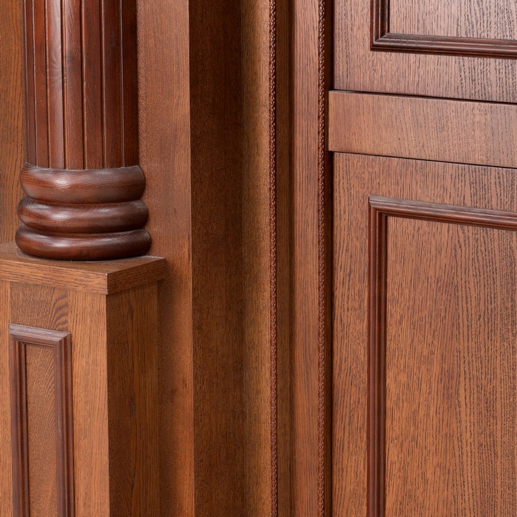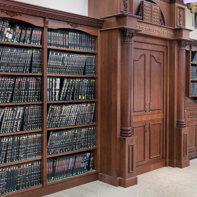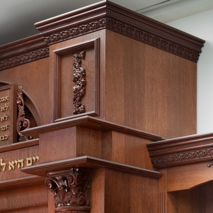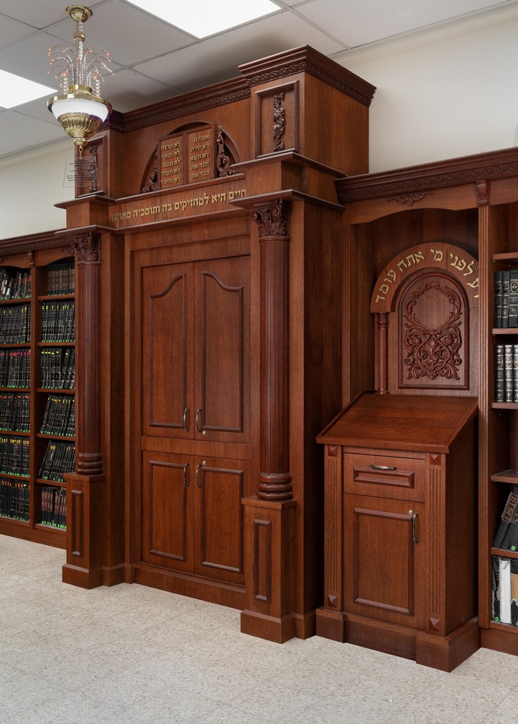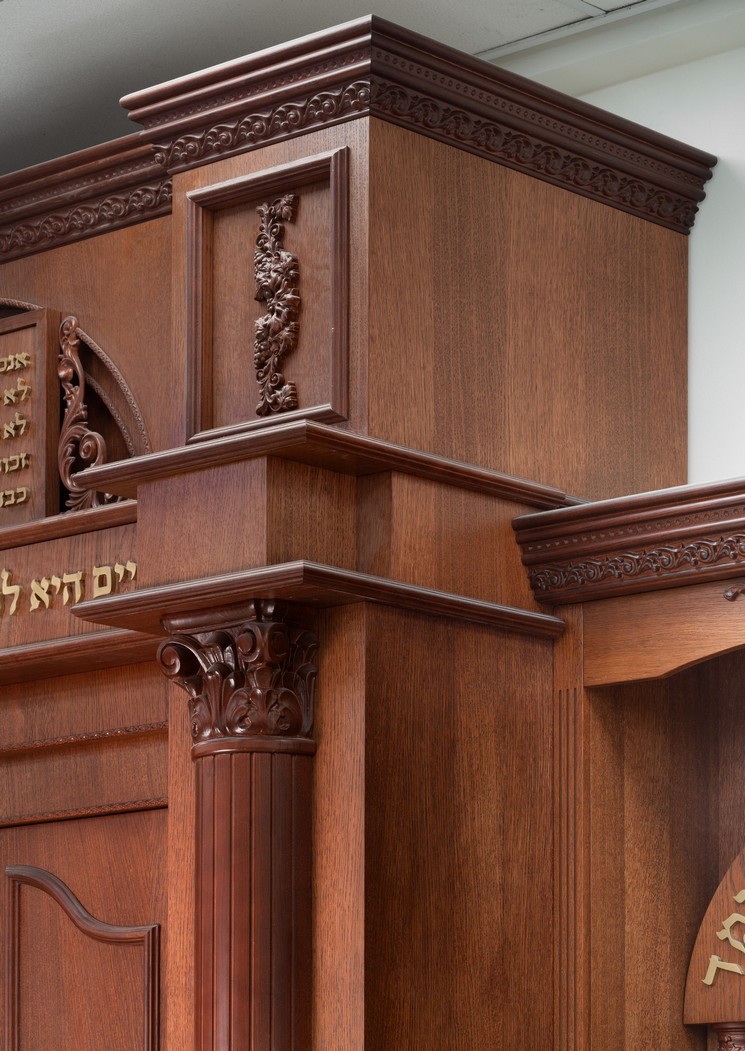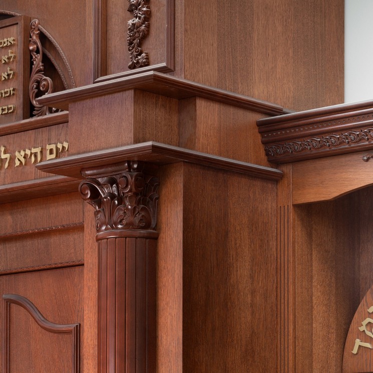 בפרוייקט: ארון קודש, עמוד חזן, חיפויי קירות, ספריות וכו' החומרים – mdf אירופאי 830 ק"ג לקוב מחופה פורניר אלון. הגילופים – עשויים cnc בשילוב ידני מעץ בוק מלא